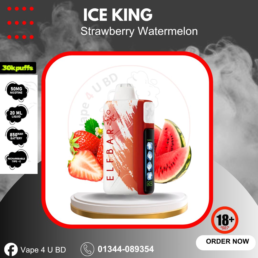 ELFBAR ICE KING 30K – Strawberry Watermelon Available now at Vape 4 U BD! A sweet blend of strawberry and watermelon with a cool icy finish. Up to 30,000 puffs, 24ml e-liquid, and 5 cooling levels for the perfect vape experience.