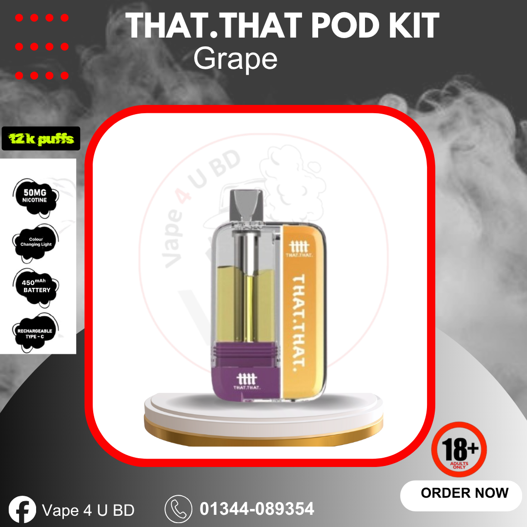 The THAT.THAT B16008 Grape Pod Kit 12K is a disposable vaping device offering up to 12,000 puffs with a grape flavor profile. It features a rechargeable 460mAh battery, a mesh coil for enhanced vapor production, and a Type-C charging port. The device includes color-changing lights and contains 5% nicotine